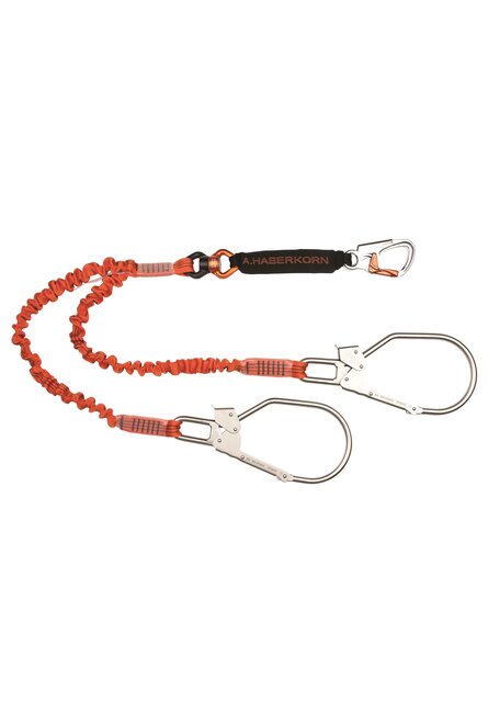 - Unteres Ende: AHK-Einhandkarabiner, Drehwirbel SWIVEL, Bandfalldämpfer ARRESTER mit abnehmbarer textiler Hülle