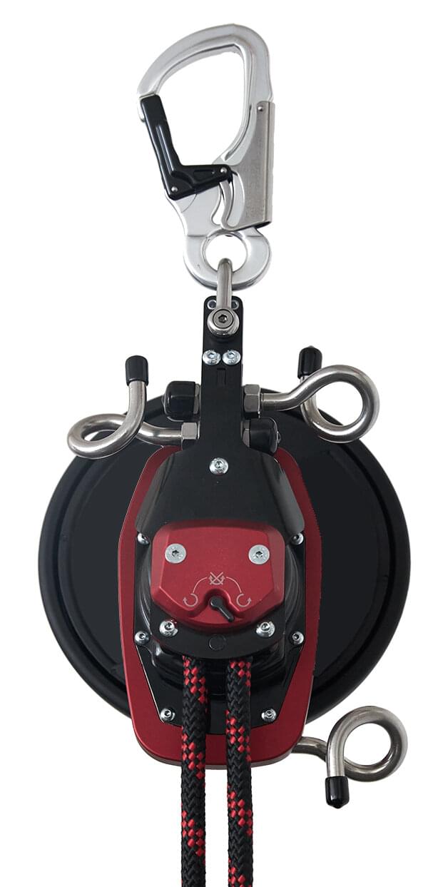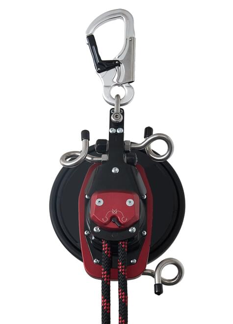 Durch 2 Fliehkraftbremsen wird der Abseilvorgang automatisch auf <2 m/s reguliert.