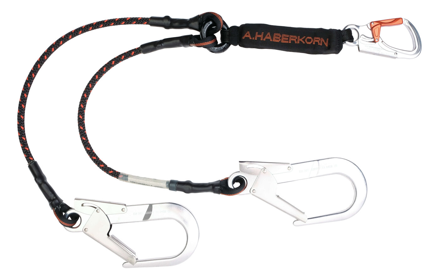 - Unteres Ende: AHK Einhandkarabiner, Bandfalldämpfer ARRESTER mit abnehmbarer textiler Hülle und teilbarer Ring